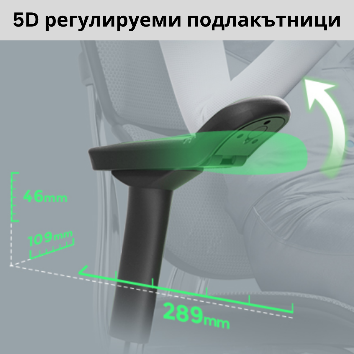 Подлакътници – 5D регулируеми, с меки полиуретанови падове.