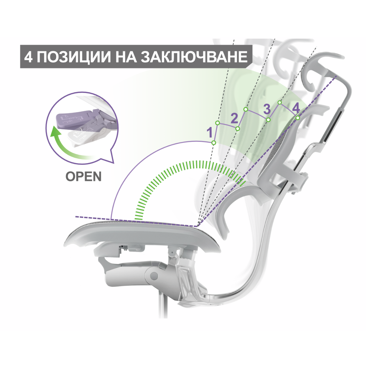 Синхронен механизъм за регулиране на наклона на облегалката със заключване в четири позиции.