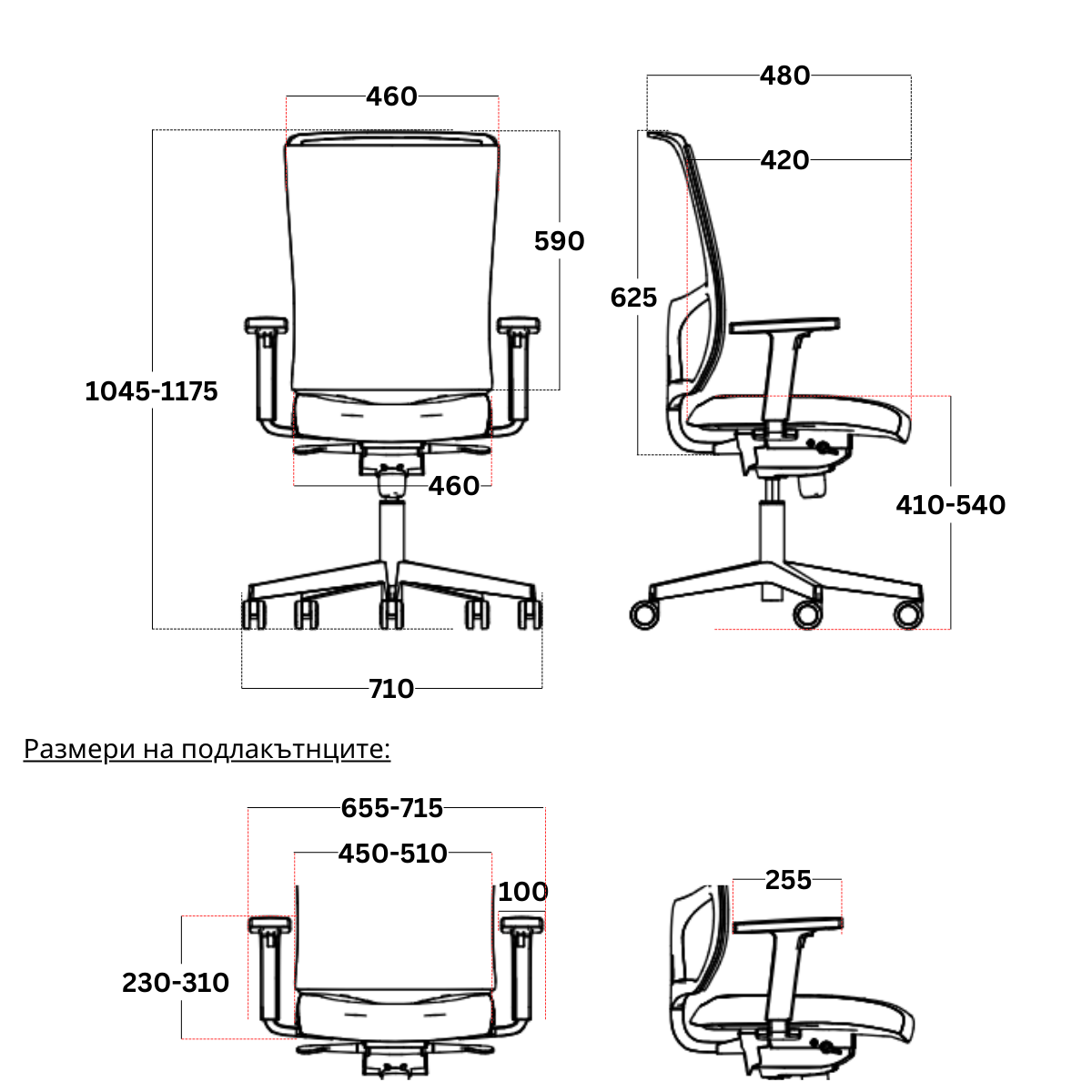 • Регулируеми подлакътници на височина, с меки полиуретанови падове.